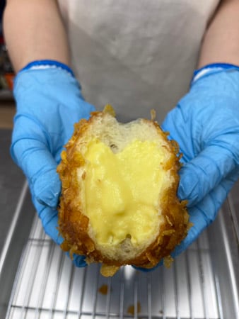 ライブ感のある揚げ工程と断面は、視覚的にもインパクトがあり、揚げたてがとにかく美味しい。まわりのフレークのザクザク感と、ふわっと生地にとろ〜りクリーム。食感のコントラストが病みつきになる新商品だ。