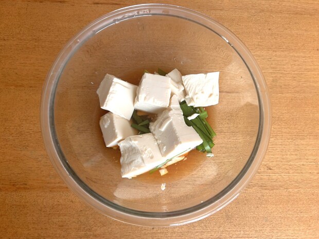 3.【1】にニラと適当な大きさに崩した豆腐を入れて馴染ませる