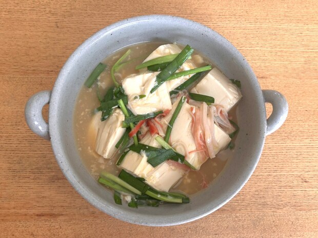 ふわふわになった豆腐が卵やニラと絡まっておいしい! 卵の甘さがまろやかでニラの香りも良いアクセントになっています。今回はニラを使いましたが、ネギやエノキ、玉ねぎなどの野菜を使ってもおいしいですよ。