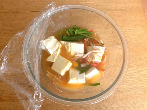 5.ボウルに裂いたカニカマと溶き卵を入れ、ラップをしてさらに2分間加熱する