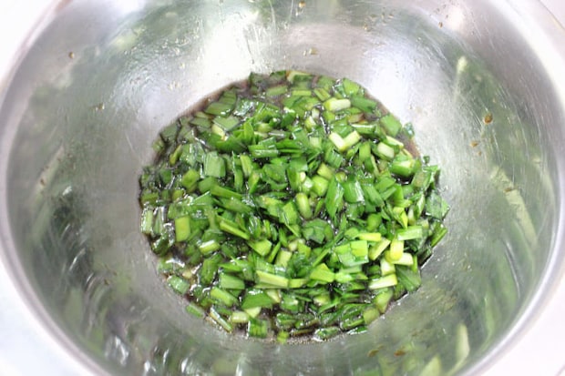 切ったニラをたれに漬けておくと、辛味が抜けておいしくなるんですって。この時点でニラと酢じょうゆの香りが広がり、もうおいしそう♪