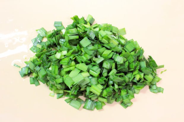今回は生のまま使うので、ニラをきれいに洗って水分を拭き取ります。1cm長さくらいに細かく切りました。