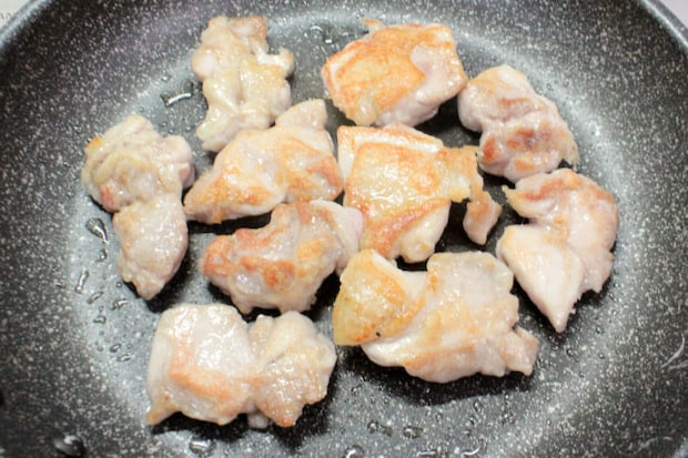 4. フライパンにサラダ油を引き、中火で熱します。鶏肉を皮目から入れ、しっかりと焼き色が付くまで焼きます。
