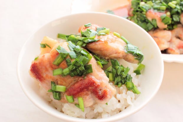 甘めでニラの香りがほんのりと広がる、おいしいニラだれ。とろみがなくサラサラとしているので、鶏もも肉と一緒にご飯にかけて丼風にいただいてみました。