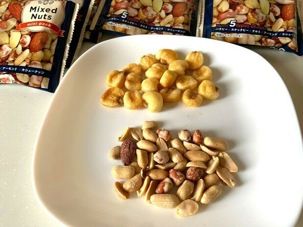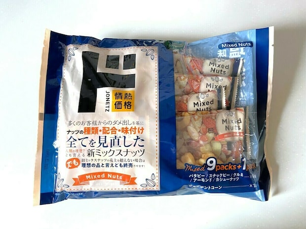 ミックスナッツ9袋と、別袋になったジャイアントコーン1袋のセットで、バタピー、スナックピー、くるみ、アーモンド、カシューナッツの5種類が楽しめます。