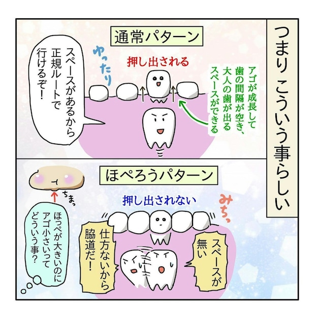 アゴの小さいほぺろうくんの場合、あたらしい歯が生えるスペースがなく、わき道に逸れて歯が生えてしまうのだそう。