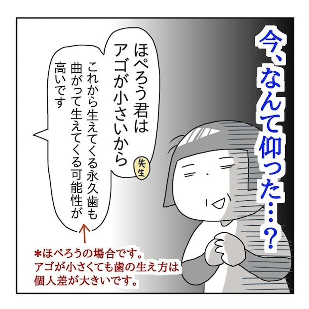 ほぺろうくんの永久歯が、「これからもまがって生えてくる可能性がある」と告げられた、ぼさ子さん。通常の生えかわりだけでも大変なはずが、さらに不安なことが増えてしまいました。