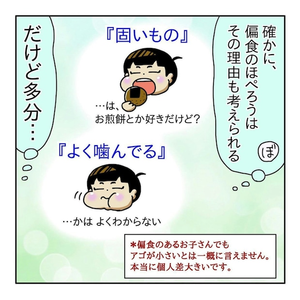 永久歯の不安要素について、説明を受けた ぼさ子さん。原因として考えられる、アゴの成長について、偏食も考えられるものの、「遺伝が一番の理由かもしれない」…と、ぼさ子さんは心当たりを探ります。