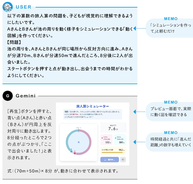 難しいプログラミングなんてできない私でも、言葉で指示するだけで「動く教材」が作れました。これは家庭学習の新しい選択肢として可能性を感じました。市販のドリルでは理解できない子に合わせて、速さを変えたり、数字を調整したりと、子どもの理解度に合わせて教材がその場で完成します。言葉だけではどうしても伝わらなかった壁を、動く図が理解のきっかけを作ってくれる。「あ、わかった!」と表情が変わる瞬間を見るのは、親として何より嬉しいご褒美です。