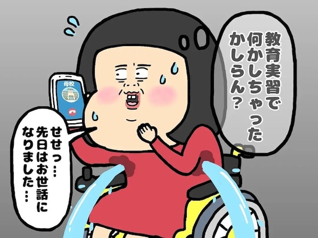特別支援学校での教育実習を終えた翌日、突然体調を崩した主人公。人一倍疲れやすく無理のできない体であることを痛感しながらも、「それでも教員になりたい」という夢を改めて胸に刻みます。そんなある日、主人公のもとに一本の電話がかかってきました。