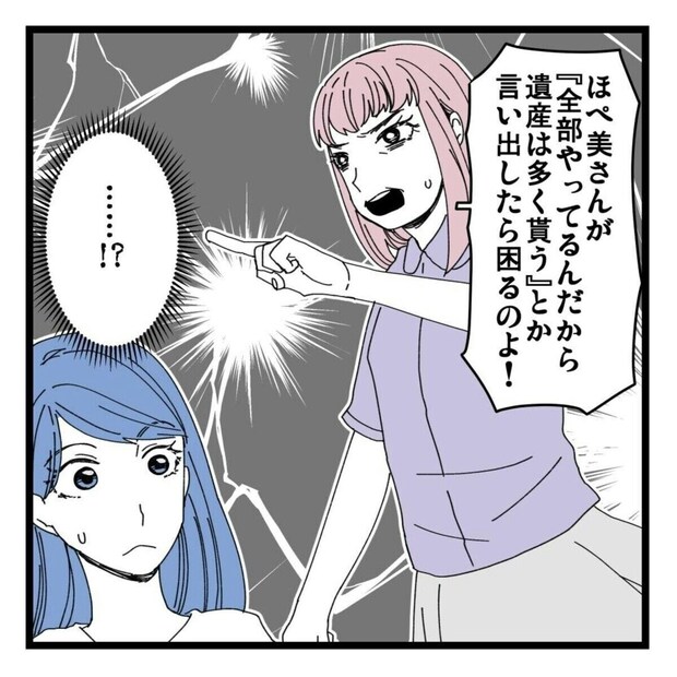 義母のお金の管理は今後自分がやると夫が言ったものの、義姉は納得せず「ほぺ美さんが遺産は多くもらうとか言い出したら困る」と怒りの矛先はなんと嫁であるほぺ美さんへと向いてきます。義姉がそんな風に自分を見ていたことに驚きを隠せないほぺ美さん。まさか義姉から遺産の話が出てくるとは思いませんし、自分が遺産目当てで義母のお世話をしていると思われていたことも衝撃だったと思います。