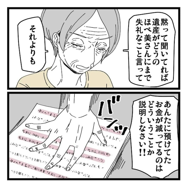 これまで黙って聞いていただけの義母でしたが、ほぺ美さんへの暴言には我慢の限界を迎えたよう。いい加減にしなさいと言い、ついに義姉に対し説明しなさいと通帳の明細を突き付けたのでした。信頼していた娘に裏切られていたというだけでも苦しいものですが、さらに非を認めず、遺産うんぬんと言い出したのには呆れてしまいますよね…。義姉は一体どう説明をするのでしょう。