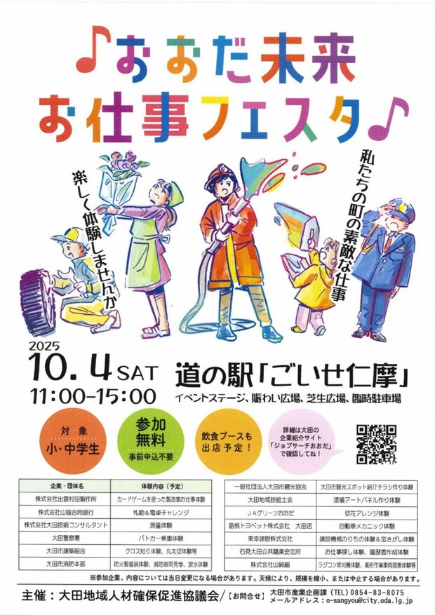 10月4日(土)に、道の駅「ごいせ仁摩」にて職業体験イベント「♪おおだ未来お仕事フェスタ♪」を開催します!