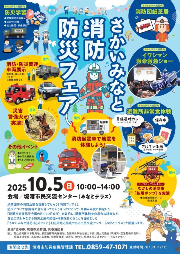 令和4年度に制定した、防災について家庭で話し合ってもらうきっかけ作りのための「境港市家族防災会議の日(10月6日)」と、消防団等の消防活動を知ってもらう「消防フェア」を集約した、まさに消防&防災のビッグイベントです!