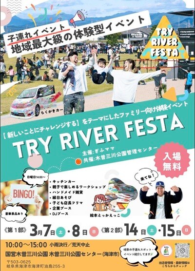 岐阜県海津市で2部制の子連れイベント「TRY RIVER FESTA」が開催される。第1部は3月7日(土)・8日(日)、第2部は3月14日(土)・15日(日)。会場は「木曽三川公園センター」で、主催は「ぎふママ」だ。