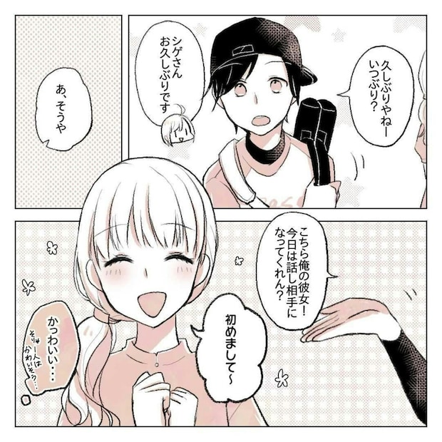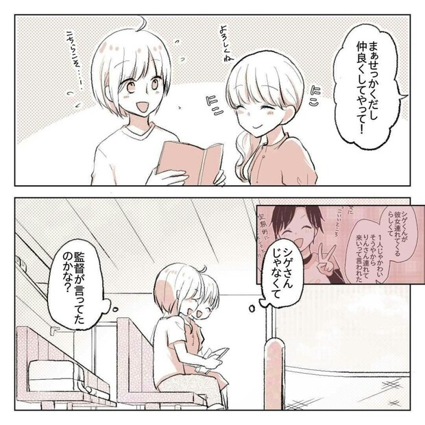 りんさんはゆーさんから言われて「シゲさんの彼女の話し相手」として草野球に来たのに、シゲさんはそんなこと頼んだ覚えはないみたいです。りんさんは少しだけ疑問を感じながらも、シゲさんの彼女と一緒に草野球を観戦することになりました。