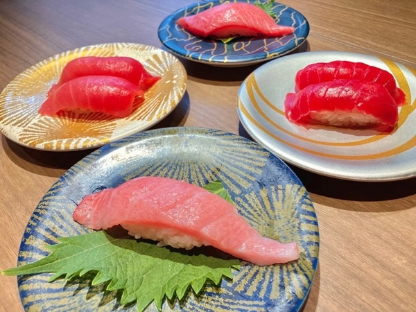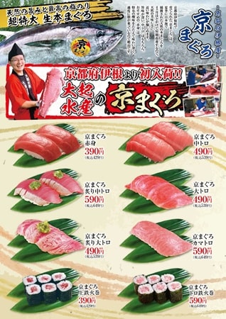 回転寿司全店では、「京まぐろ赤身」2貫390円(税別)、「京まぐろ中トロ」2貫490円(税別)、「京まぐろ大トロ」1貫490円(税別)、「京まぐろカマトロ」1貫590円(税別)を用意。なお、店舗によっては販売していない商品があり、天候や交通事情等で入荷がない日もある。また、商品は十分に用意しているが、品切れの場合もある。