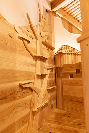 同遊具は、内側の遊び場のプロデュース・設計・遊具製作はやまのおうちが行い、エコ建築考房が外側の建物を建築した。国産の木材や漆喰といった自然素材を用い、熟練の職人が丁寧に手作りしたものだ。