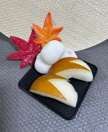 昇り外階段の入口には、全長約2mの巨大「秋満月オブジェ」が登場し、まるで満月のような梨のオブジェが、人々を出迎える。