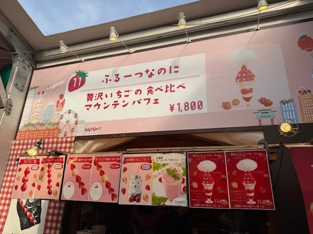 46店舗出店されているので、何を食べようかとっても迷ったのですが、私が選んだのは見た目も映えな【ふるーつなのに】というお店の【贅沢いちごの食べ比べマウンテンパフェ】を頂きました♡