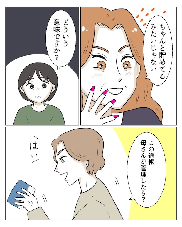 毎月きちんと貯金してあることを確認すると、さっきまで険しい顔をしていたエミさんは「ちゃんと貯めてるみたいじゃない」とにんまり。「どういう意味ですか?」と聞いた私の問いはスルーして、タクマさんが「この通帳、母さんが管理したら?」とエミさんに言いました。