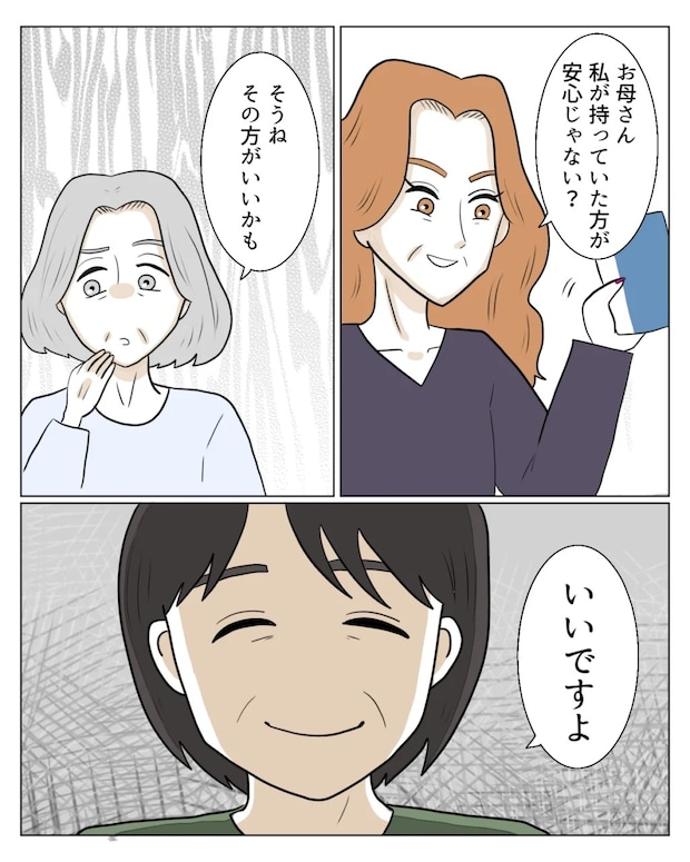 エミさんはタクマさんから通帳を受け取ると「お母さん、私が持っていた方が安心じゃない?」と義母に問いかけ、義母も「そうね。その方がいいかも」と同意。私は笑顔で「いいですよ」と伝えました。
