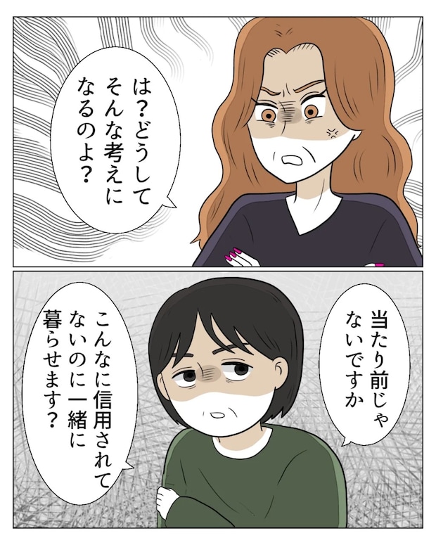 エミさんの顔から笑顔が消え、「は?どうしてそんな考えになるのよ?」と怒りを滲ませました。それでも私は怯むことなく「当たり前じゃないですか。こんなに信用されてないのに一緒に暮らせます?」と冷めた口調で返しました。これまでは何を言われても笑顔で受け流してきましたが、ここまで言われたらもう黙っていられません。