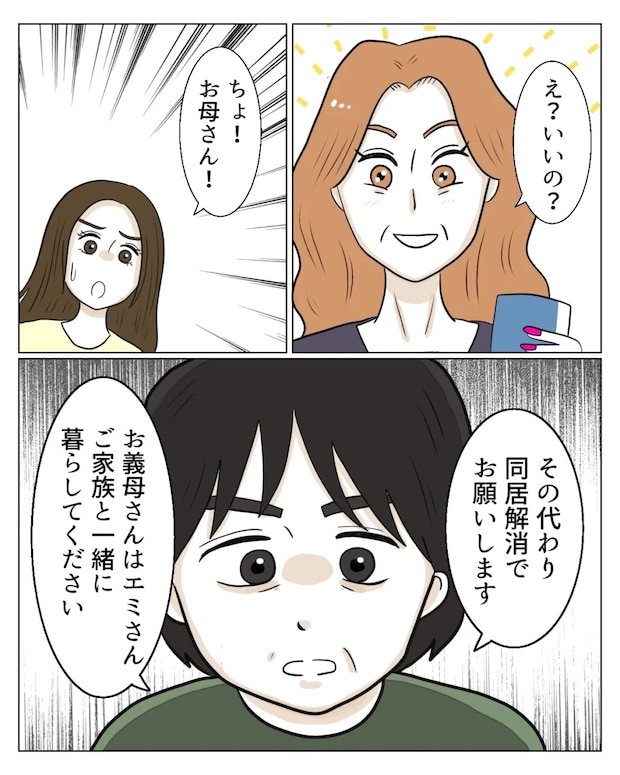 通帳の管理を任せると言うと「え?いいの?」とエミさんの顔がパッと明るくなりました。「ちょ!お母さん!」と真矢が止めようとしましたが、私は真っ直ぐ前を見て「その代わり、同居解消でお願いします。お義母さんはエミさんご家族と一緒に暮らしてください」とはっきりと伝えました。