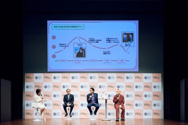 同イベントでは、テレビでもおなじみの盛山さんの若手時代(体重125kg)の写真から現在までの体重推移がグラフで公開されたほか、「肥満症」に関するクイズも実施。また、全国から募集した「肥満症のただしいミカタ川柳」の受賞作も発表されました。