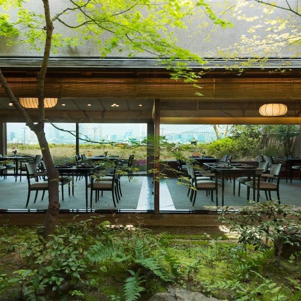 ・数寄屋造りの店内は、日本庭園とその先に東京湾を望む落ち着いた空間