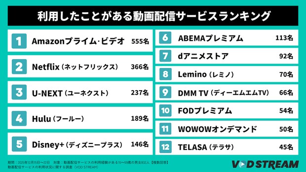 利用したことがある動画配信サービスランキング(VOD STREAM)