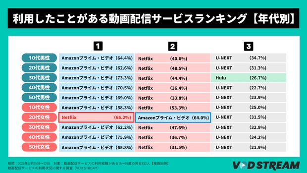 なお、年代・性別のクロス集計では、ほぼ全セグメントで「Amazonプライム・ビデオ」が首位を獲得するなか、女性20代のみ「Netflix」が65.2%と、「Amazonプライム・ビデオ」(64.0%)をわずかに上回りました。