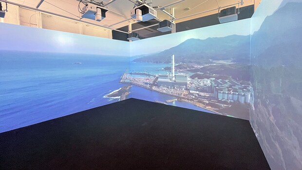 中国電力・三隅発電所の構内にある「三隅発電所ふれあいホール」では、石炭火力発電の仕組みを楽しく学べるバーチャルツアーを開催しています。通常は見ることができない、石炭船から石炭を払い出す様子や、上空から見た発電設備の映像などを大迫力で体験できます。
