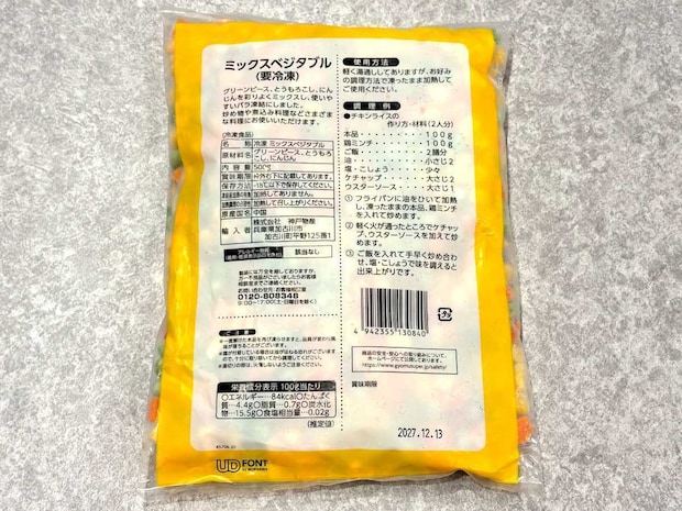 内容量は500gと業務スーパーらしくたっぷり入って、価格はなんと税込158円!某人気スーパーの冷凍ミックスベジタブルは300円を超えていたので、業務スーパーの商品がいかに安いのかがわかりますね!
