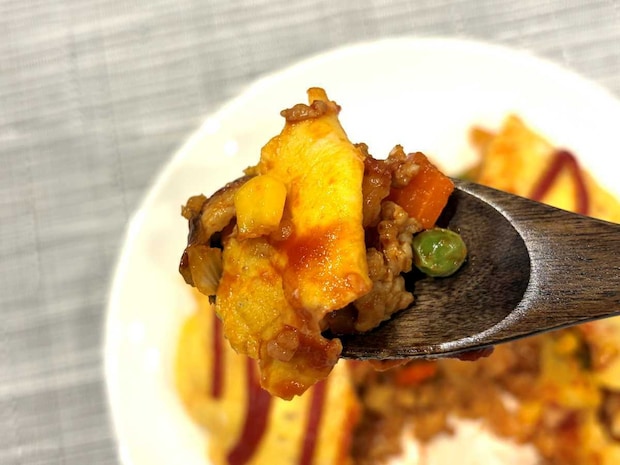 オムライスなのでケチャップライスにミックスベジタブルを混ぜ込んでいますが、彩りは豊かな印象!中身が茶色っぽくなりがちなオムライスでも、ミックスベジタブルを使うことで食欲をそそる見た目になりますよ♪