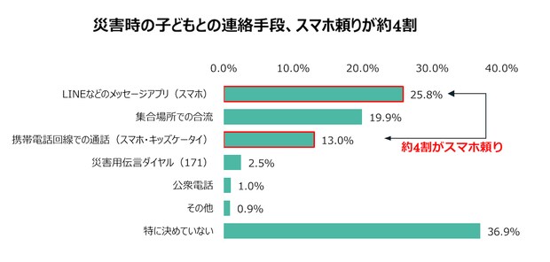 災害時に子どもとの連絡手段として最も頼りにしている方法を尋ねたところ、災害用伝言ダイヤル「171」を選んだのはわずか2.5%にとどまり、LINEなどのメッセージアプリ(25.8%)やスマホなどでの通話(13.0%)が約4割を占め、スマホに依存した連絡手段への偏りが見られました。