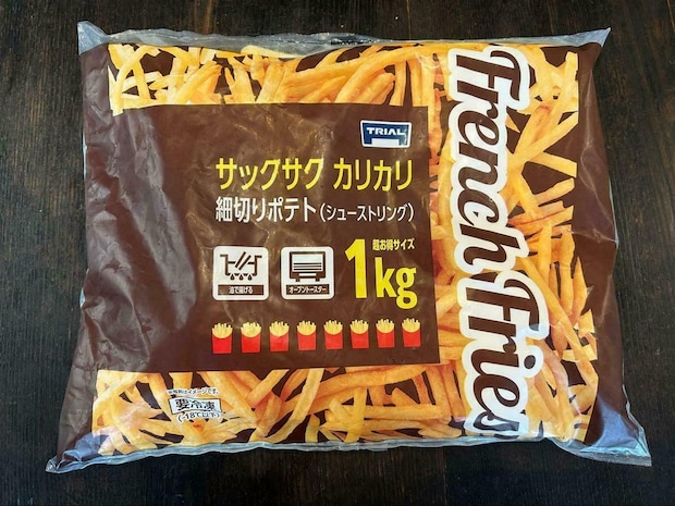 トライアルの冷凍コーナーで圧倒的な存在感を放つ「細切りポテト」。手に持つとずっしり重く、驚きの大容量でコスパ抜群の逸品です。細めのシューストリングカットで、揚げると外はカリッ、中はサクッとした軽やかな食感が楽しめます。