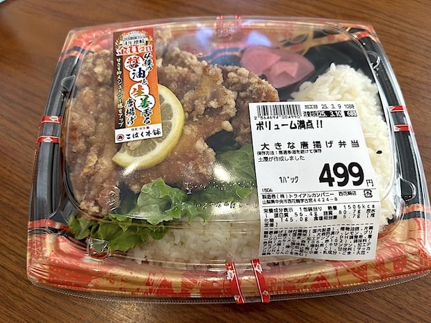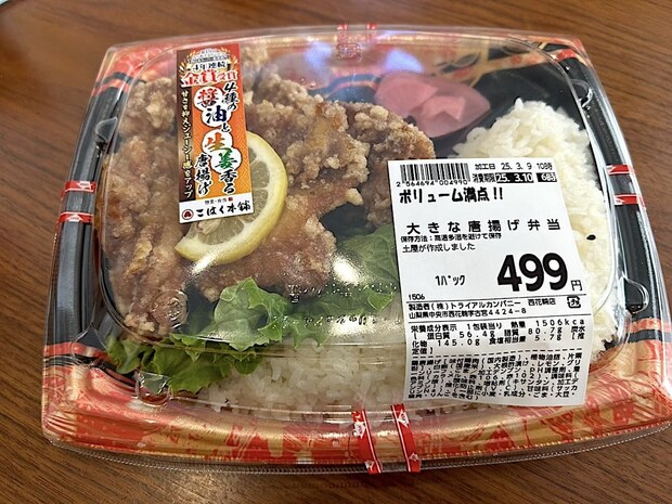お弁当には、溢れんばかりの大きな唐揚げが3つも入っています。