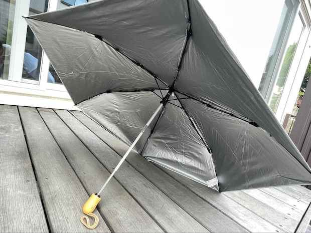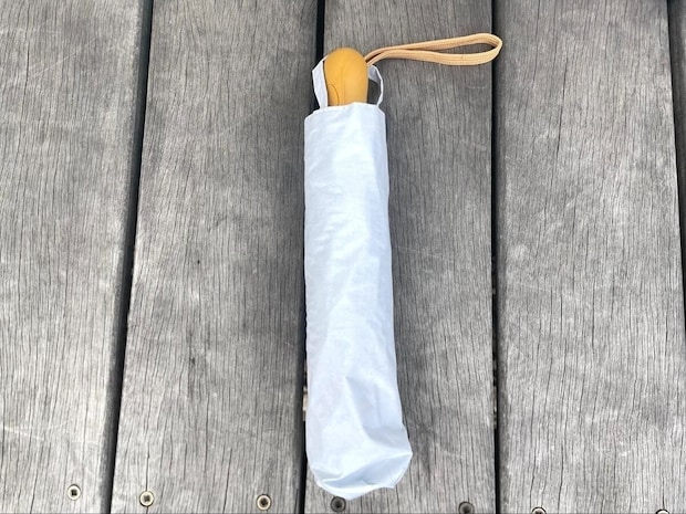 遮熱・遮光に特化した晴雨兼用の傘です。外側はオフホワイト、内側はアルミのようなシルバーコーティングで、日差しを跳ね返してくれる設計です。重さも222gと比較的軽く、またワンタッチ自動開閉なのもうれしいところ。