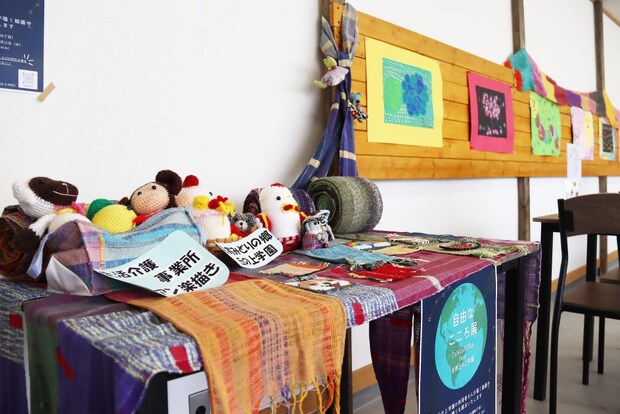 今回展示されている作品は、名寄みどりの郷が運営する名寄丘の上学園の利用者が制作したもので、規則に縛られない制作者の感性が自由に表現できる「さをり織り」で作ったマフラー、テーブルクロス、コースターなどの作品や、絵画などがずらりと並ぶ。来店者が作品を楽しみながら、ゆっくりとくつろぐ姿が見られている。