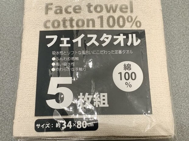 価格は548円(税込)で、1枚当たり約109円と非常にお買い得なのが魅力のフェイスタオルです。