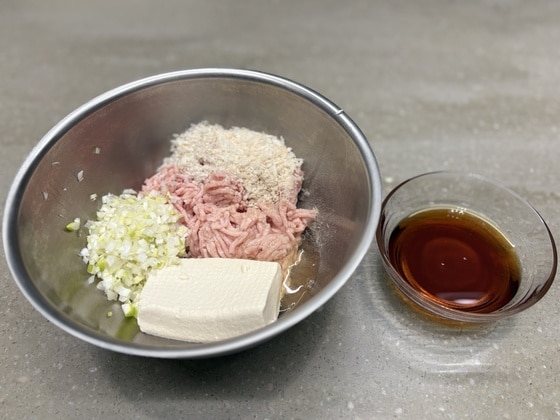 豆腐は軽く水切りをしておきます。みじん切りしたネギとその他の材料をよく練り混ぜたらタネの準備は完了。