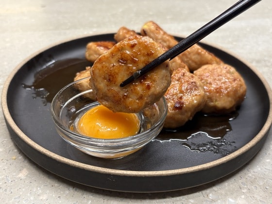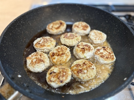 タネを丸めて、油をひいたフライパンで焼いていきます。両面焼き色がついたら、合わせタレを入れて煮絡めて完成!