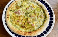 対して耳の部分は分厚くもちもち食感で、食べ応えも抜群の仕上がりです!具材に関してはベーコンと2種類のチーズ、その上にバジルソースを使用。