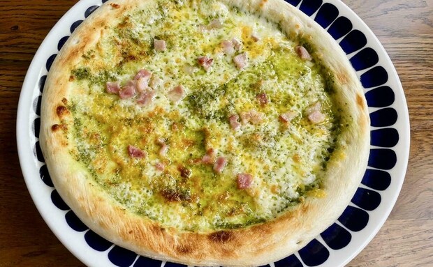 対して耳の部分は分厚くもちもち食感で、食べ応えも抜群の仕上がりです!具材に関してはベーコンと2種類のチーズ、その上にバジルソースを使用。