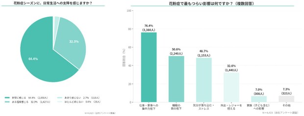 調査によると、花粉症に悩む人の97%が日常生活に何らかの支障を感じていると回答しています。さらに、そのうち64%は「生活に深刻な支障がある」と感じていることも明らかになりました。