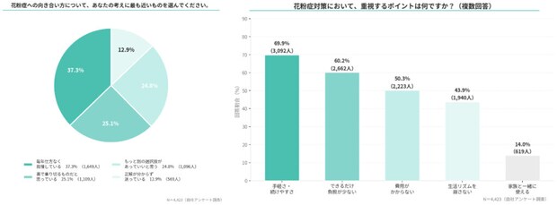 花粉症対策といえば、薬を使うか、症状を我慢するか――。そうした限られた選択肢のなかで、多くの人が悩みながら過ごしているのが現状のようです。一方で、対策を選ぶ際に重視するポイントとして多く挙げられたのは、「手軽さ」や「続けやすさ」でした。およそ7割の人が、無理なく続けられる方法を重視していると回答しています。さらに、身体への負担や費用なども、対策を考えるうえで大切なポイントとして挙げられていました。