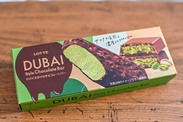 新商品「ドバイスタイルチョコレートバー」は、ピスタチオペーストをたっぷりと使ったピスタチオアイスを、揚げ麺とフィアンティーヌが入ったチョコレートでコーティングした商品です。