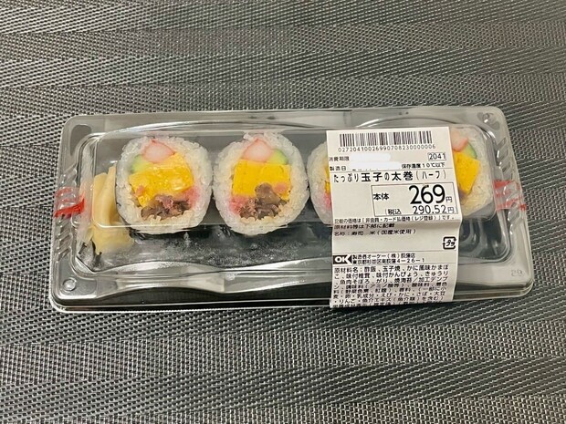 おいしそうな玉子焼き入りの太巻きが4個入っています。
