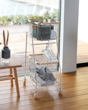「リヴ キャリーバスケットワゴン-S」は、大きさの異なるバスケット棚が使いやすいワゴン。取手付きのバスケットは取り外して持ち運ぶことができ、よく使うものをまとめて移動できる。